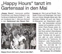 Happy Hours, Hannovers größter Freizeitclub und Dance-College in der Ferdinand-WAllbrecht-Straße 17, lädt am Vorabend des 1. Mai zum Schwof in den Gartensaal des Neuen Rathauses ein. Wer Lust auf Musik, Tanz, Spaß, Flirten und Vergnügen hat, kann bis zum frühen Morgen dabei sein. Bei schönem Wetter ist auch der Open-Air-Biergarten am Maschteich geöffnet. Der Veranstalter rechnet wieder mit hunderten von fröhlichen Party-People jeden Alters. Wer sich ein Ticket für fünf Euro sichert (Abendkasse sieben Euro) nimmt auch an einer Tombola teil. Zu gewinnen gibt es unter anderem Gutscheine für Tanzkurse, Solarium- oder Restaurantbesuche. Kartenvorbestellung unter Tel.: 0511 / 88 88 11. Geöffnet ist der Gartensaal am Mittwoch, 30. April ab 19 Uhr.